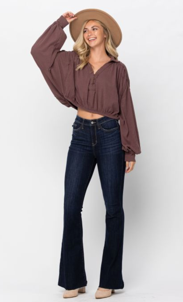 High waist raw hem, tall flare. The raw hem allows for you to cut them if they are too long. Flare jeans naturally roll up so cut/hem at your own risk.