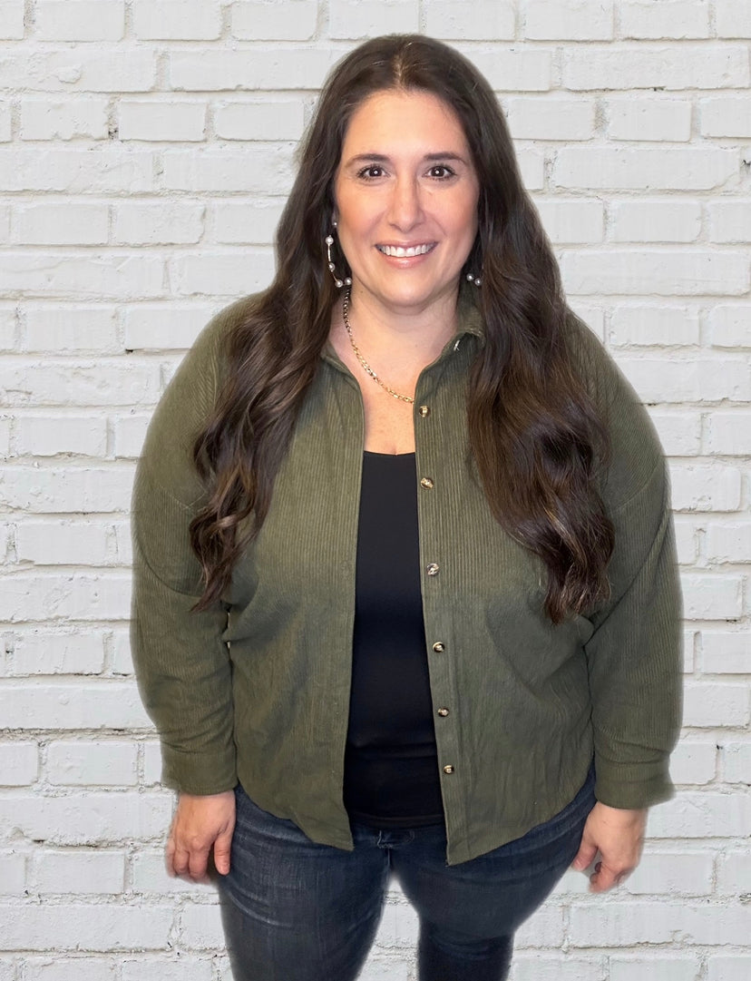 Introducing the Olive Corduroy Shacket: crafted from ultra-soft corduroy, this shacket provides a warm, comfortable layer with timeless style. Perfect for layering on chilly days, it strikes a balance between the practicality of a jacket and the coziness of a shirt.