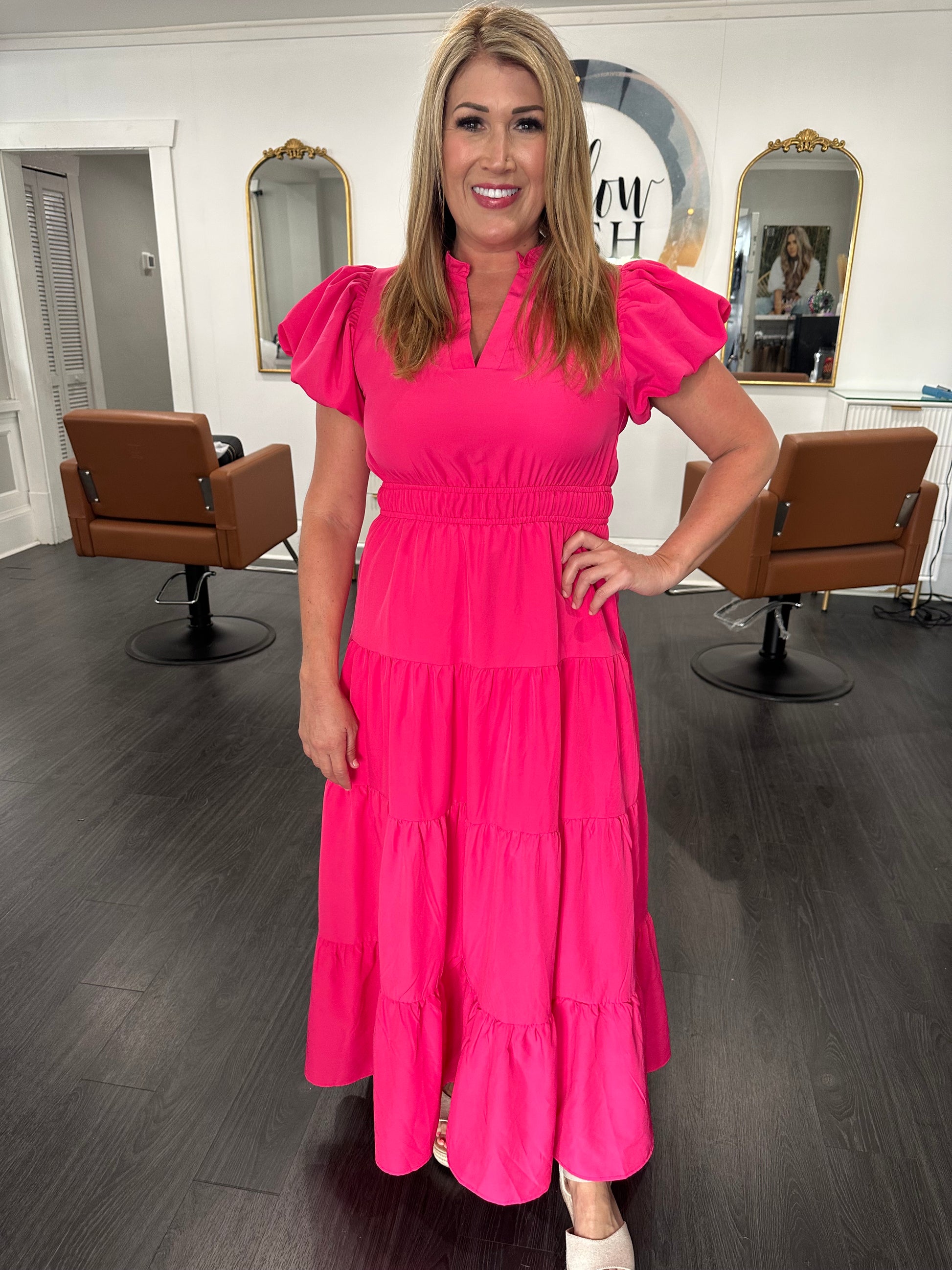 Elevate your style with our Pretty In Pink Dress. This solid maxi dress features a ruffled V-shaped neckline, puffed sleeves, smocked waistline, and a tiered bottom. Designed to flatter your figure and add a touch of femininity to your wardrobe, this dress is perfect for any occasion.